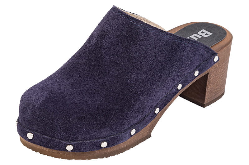 Elegantní dámské dřeváky BUXA OS71 z jemného nubuku v tmavomodré barvě. Uzavřená špička, stabilní široký podpatek a dřevěná podešev z lipového dřeva pro pohodlný došlap.