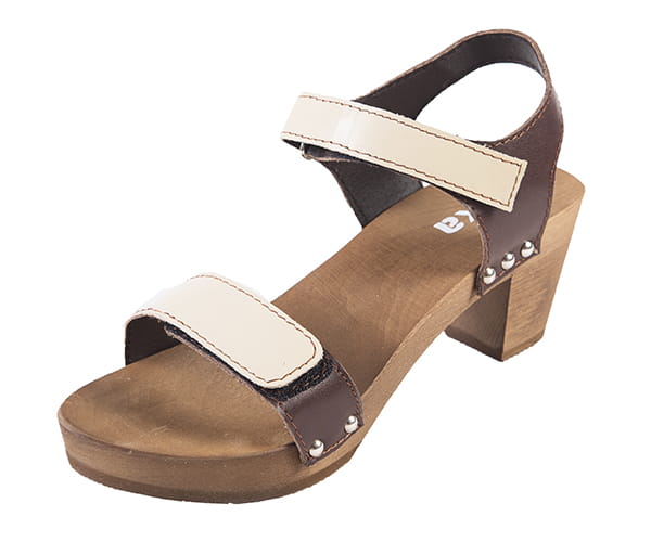 Tyto elegantní sandály jsou vyrobeny z lehkého lipového dřeva a svršku z pravé dvojité přírodní kůže , který je ke spodní dřevěné části přichycen vkusnými kovovými nýty . Kožené pásky se suchým zipem zajišťují přizpůsobivé a pohodlné upevnění obuvi k noze. Tvarování dřevěného spodku poskytuje v kombinaci s možností regulace svršku pevné a pohodlné uložení chodidla , což má za následek správné držení těla. Podélně tvarovaná klenba napomáhá tvarování plochých nohou. Vlastnosti dřeva a kůže zajišťují dobré sání potu, čímž se nohy nezapařují.