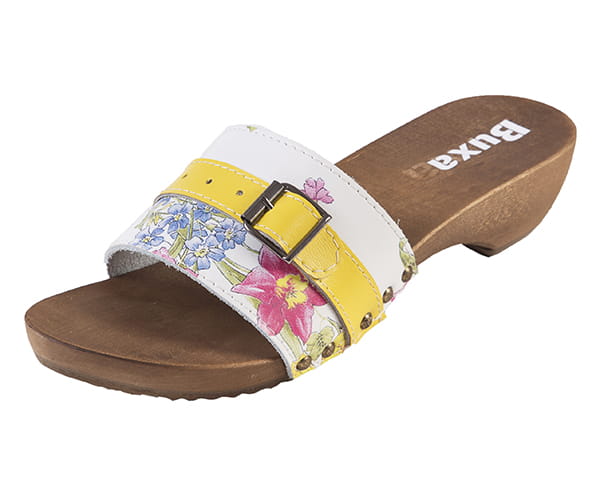 Tyto elegantní pantofle jsou vyrobeny z lehkého lipového dřeva a svršku z pravé dvojité přírodní kůže, který je ke spodní dřevěné části přichycen vkusnými kovovými nýty. Kožený pásek, kombinovaný s kovovou přezkou, slouží pro lepší přizpůsobení obuvi k chodidlu. Tvarování dřevěného spodu zajišťuje v kombinaci s možností regulace svršku pevné a pohodlné uložení chodidla, co má za následek správné držení těla a tím zmírňuje bolesti páteře a kloubů.